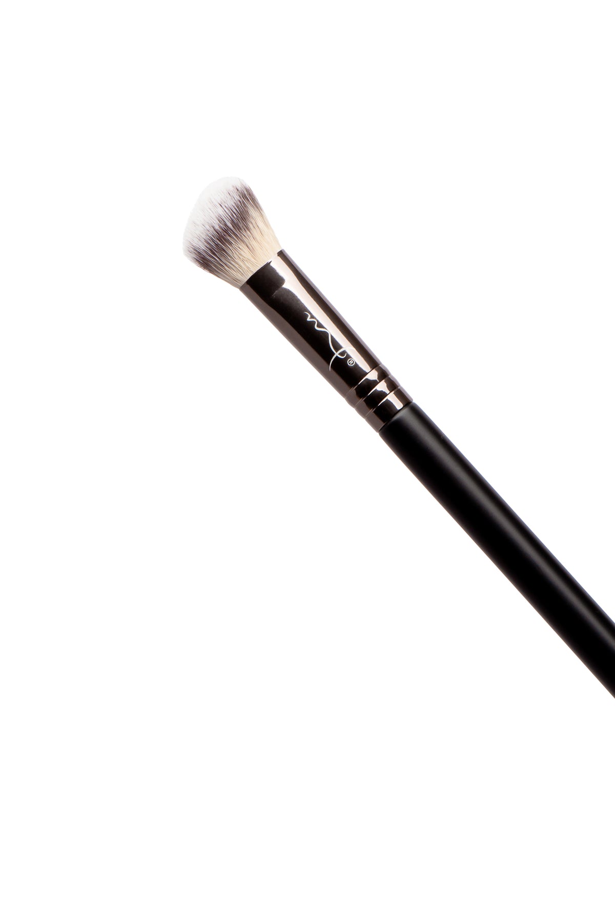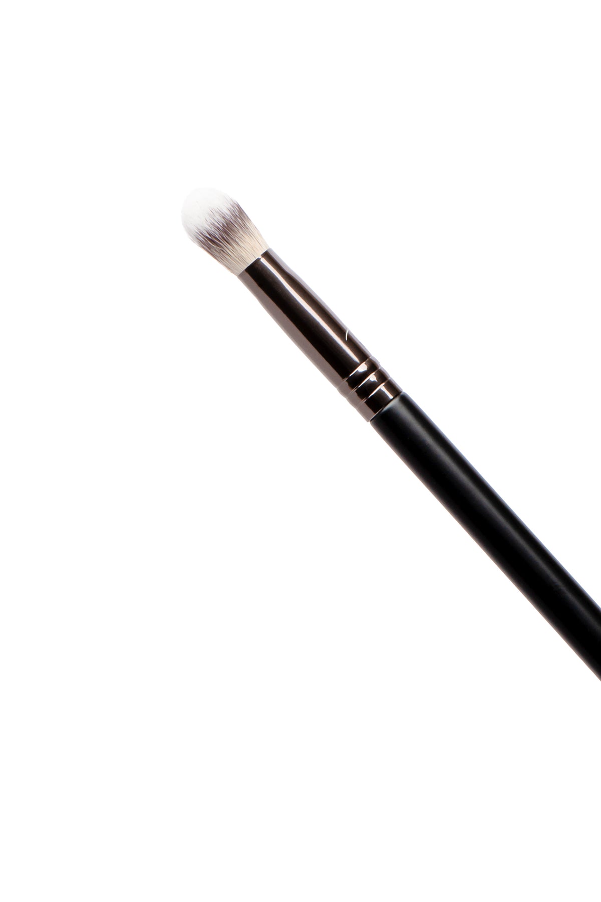 Brocha de fibras suaves con corte angular. Aplica y difumina productos en polvo y crema en ojos y nariz.