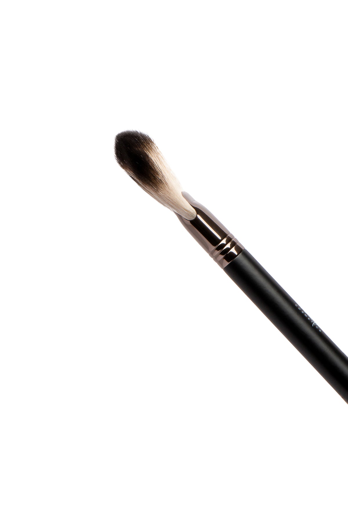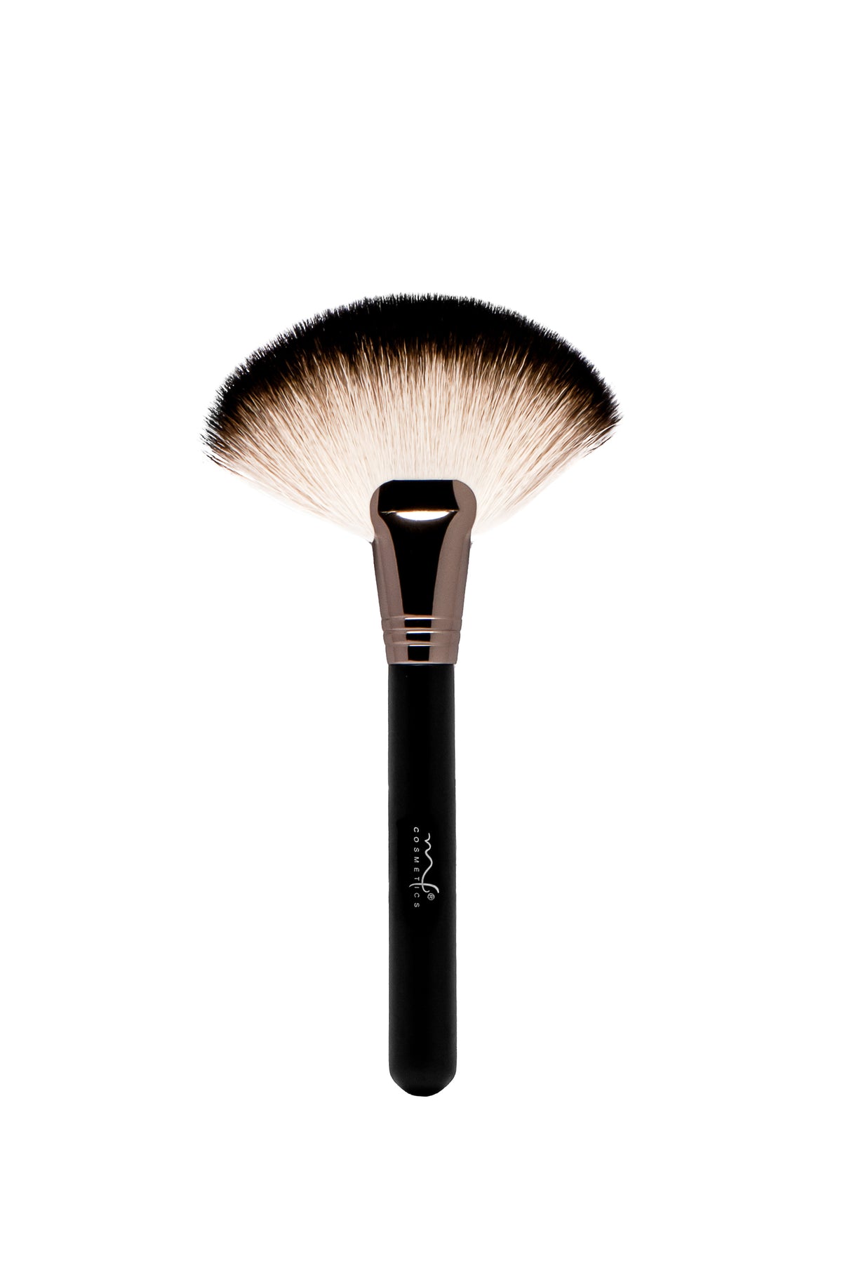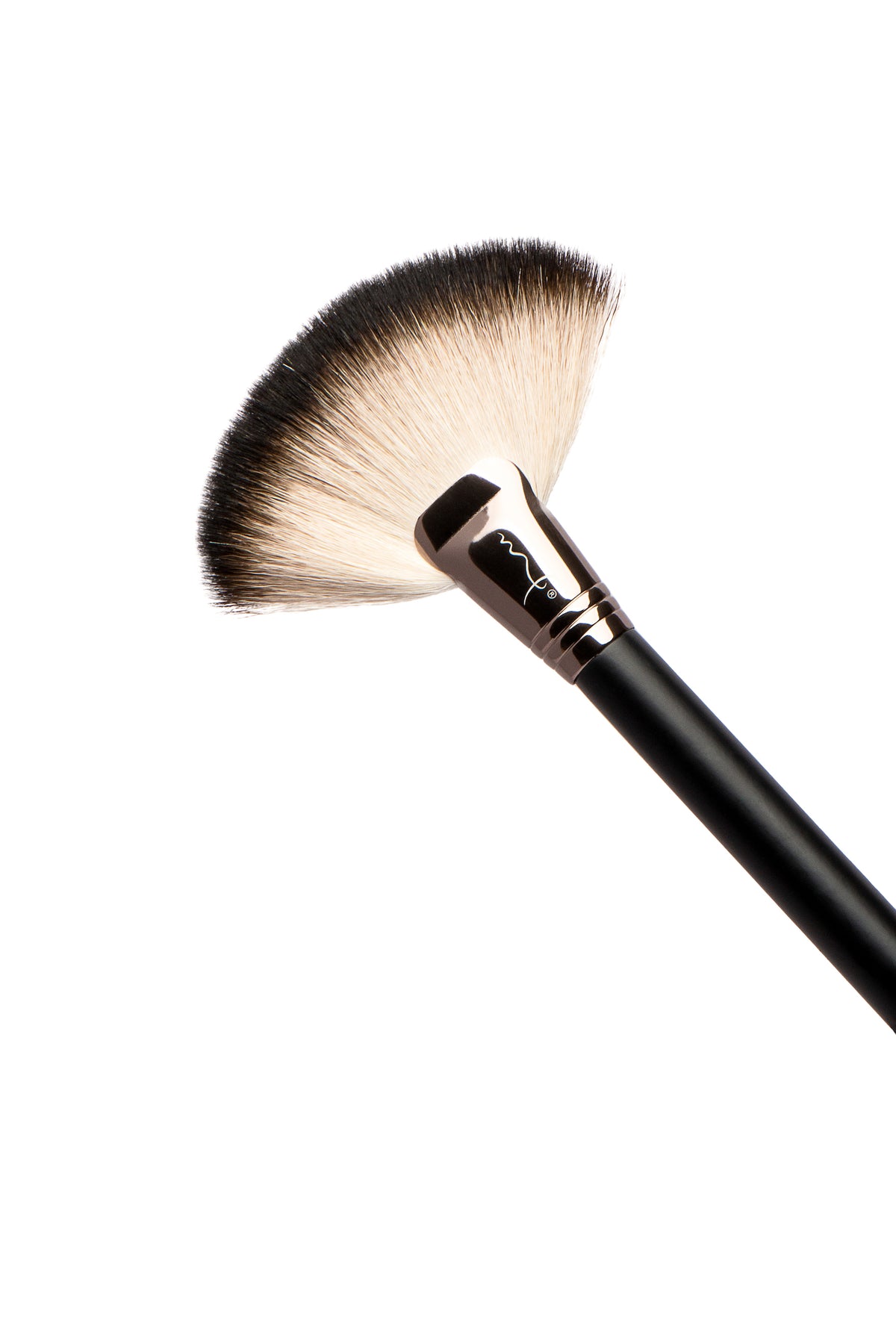 Brocha en forma de abanico grande. Remueve los residuos de cosmético o aplica productos en polvo de manera ligera en zonas altas del rostro y cuerpo.