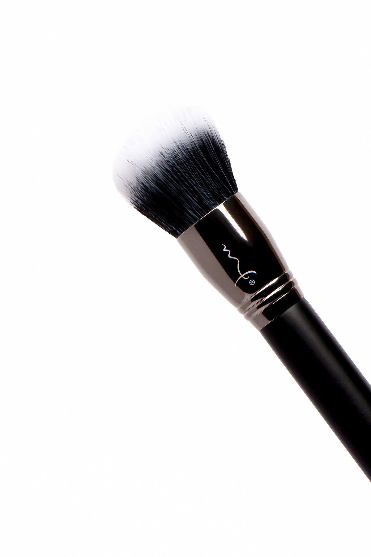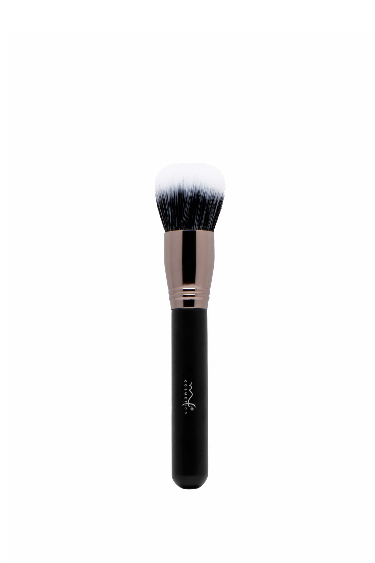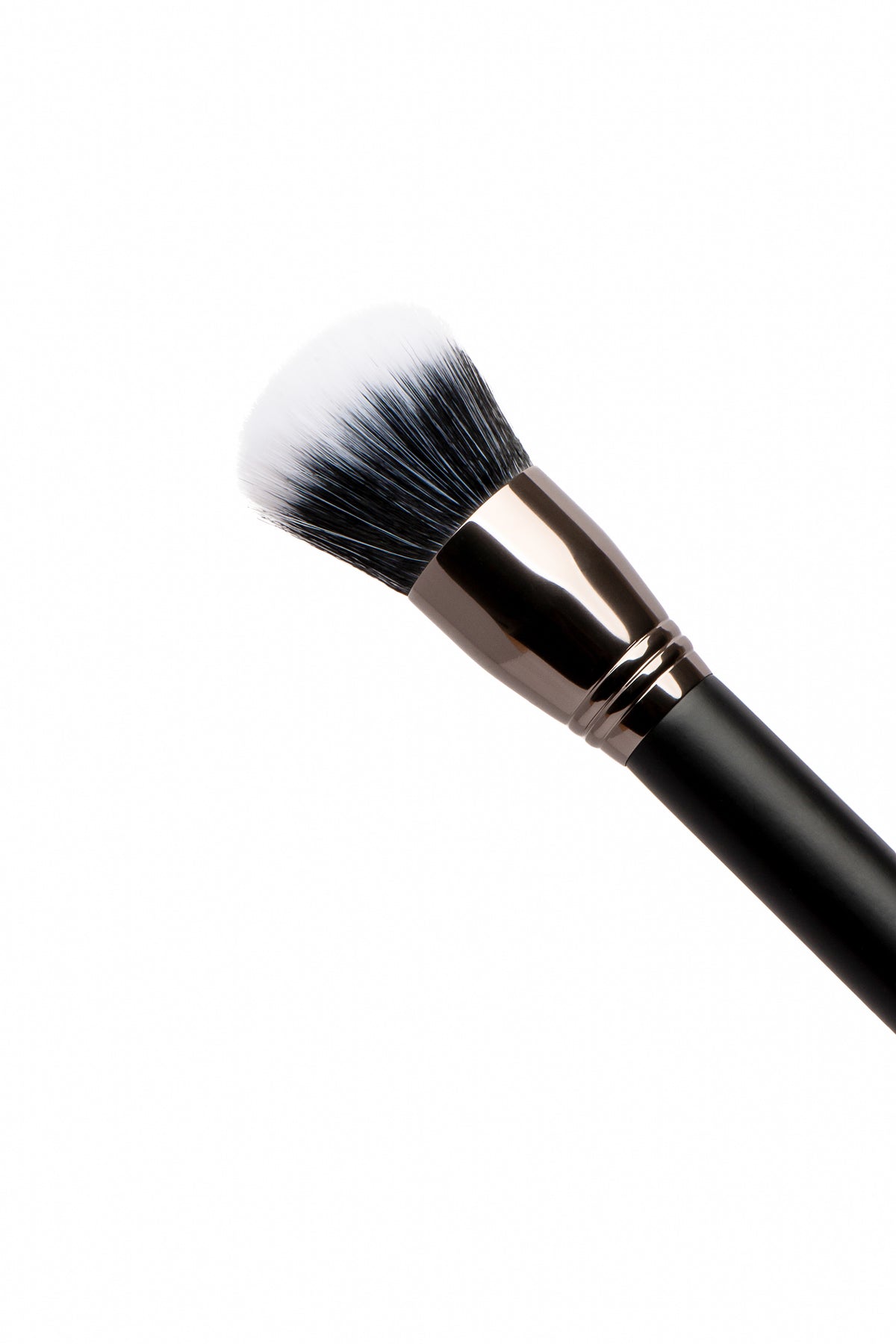 Brocha de doble fibra larga densa con corte redondo. Aplica productos en polvo, líquidos y crema con acabado pulido en la piel.