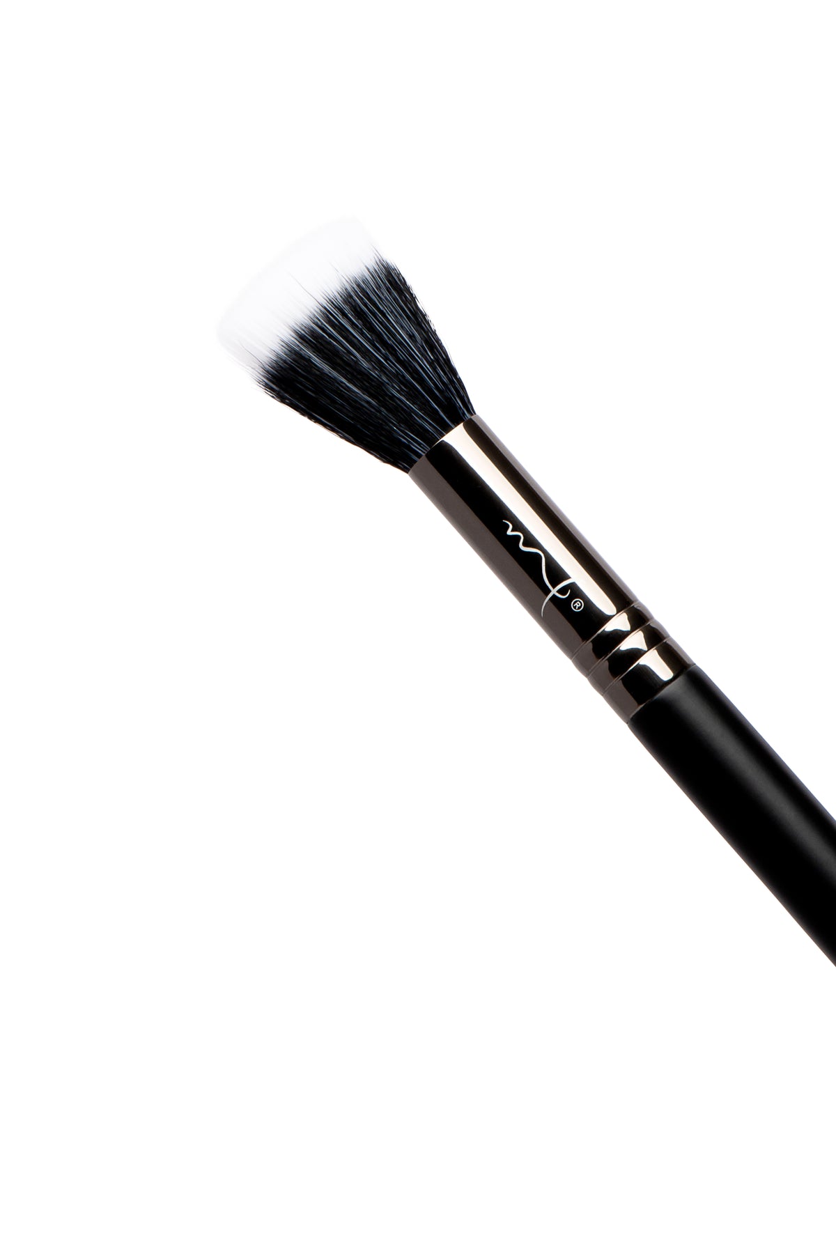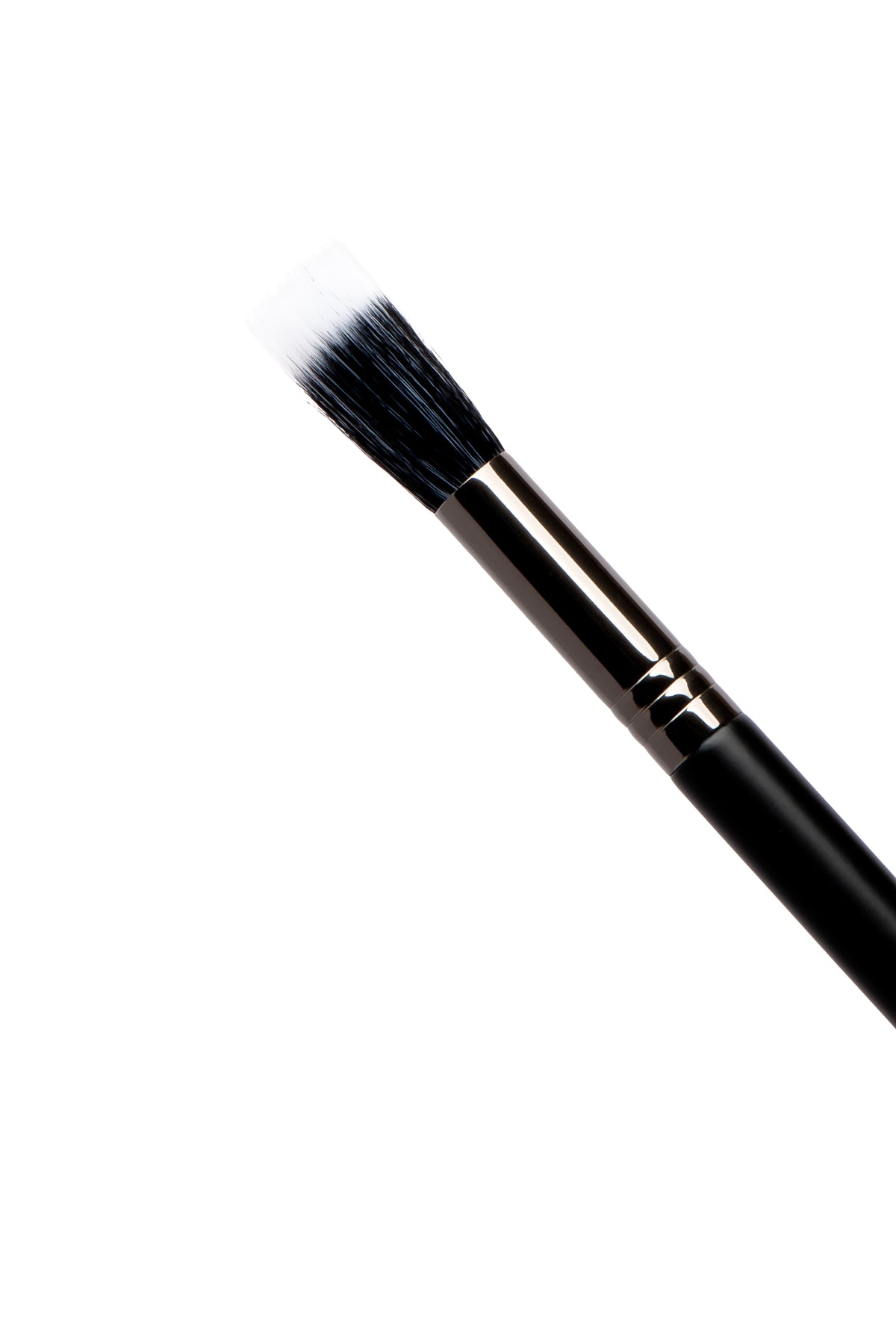 Brocha de doble fibra larga con corte recto. Aplica productos en polvo, líquidos y en crema con acabado pulido en la piel.