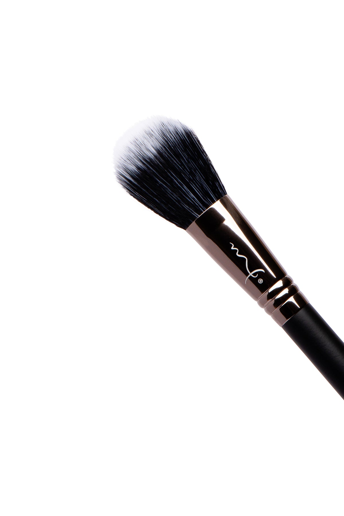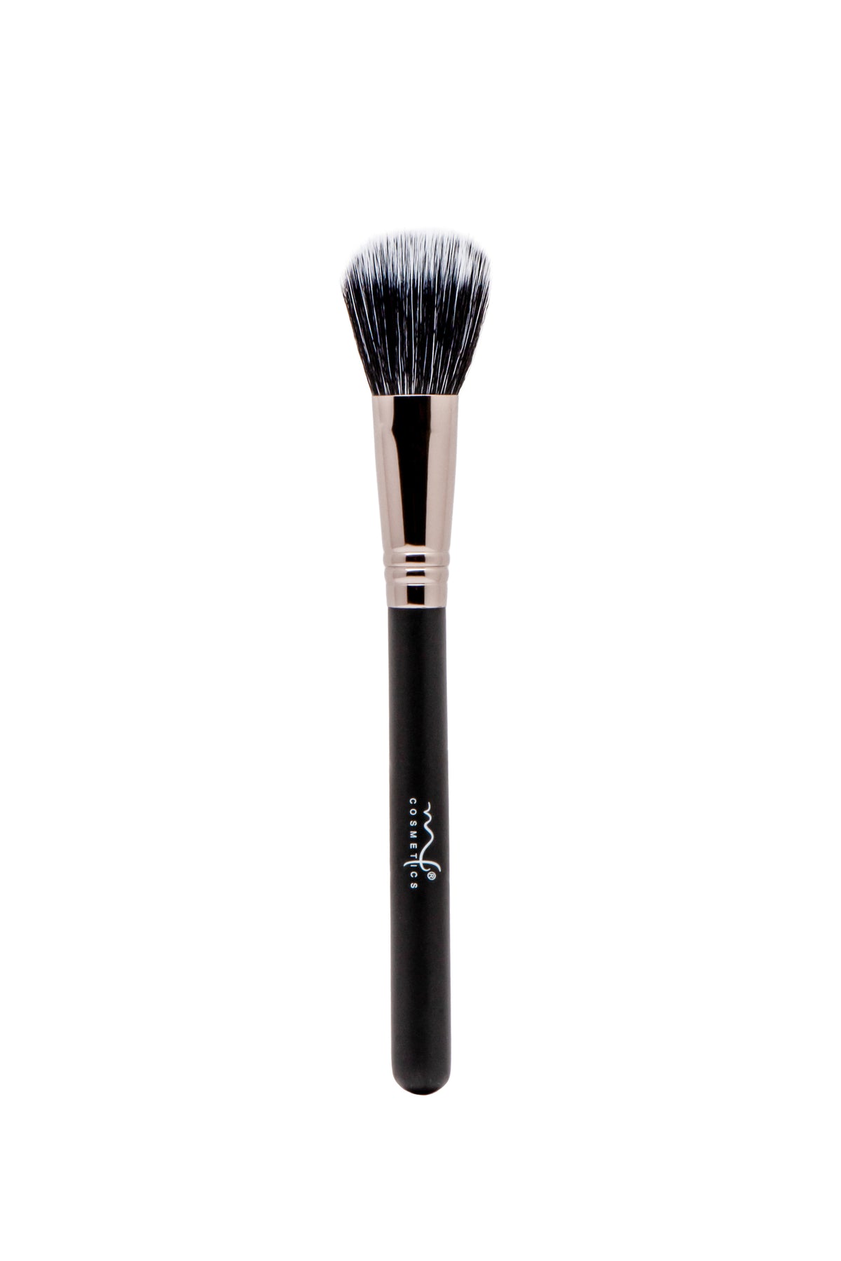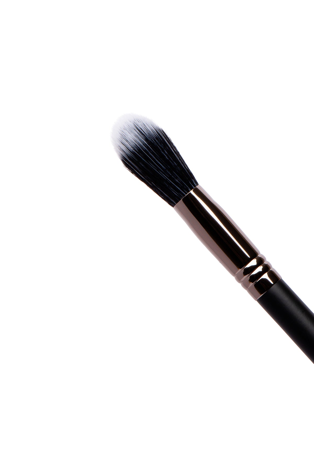 Brocha de doble fibra con punta redonda. Aplica productos en polvo, líquidos y en crema con acabado pulido en la piel.