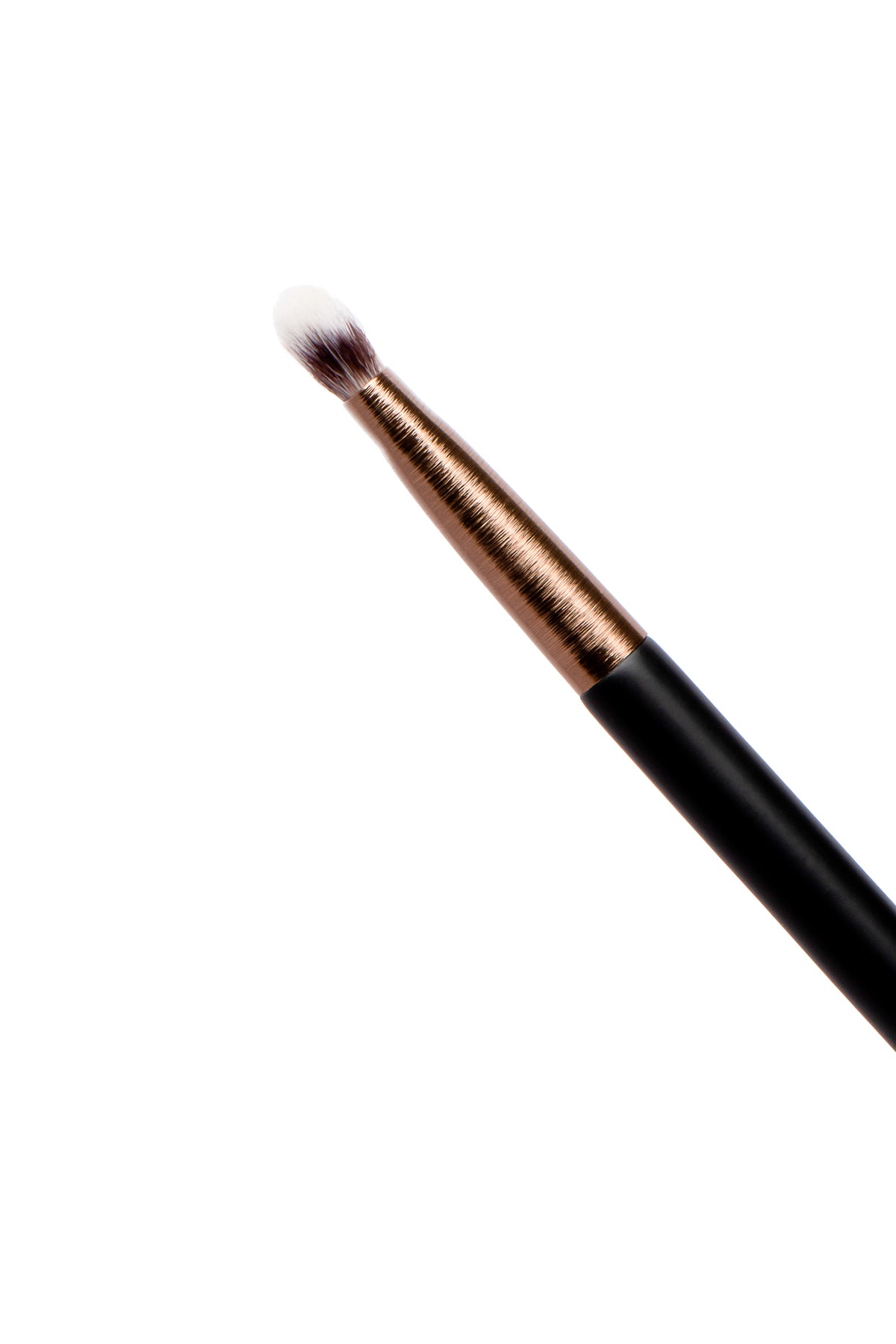 Brocha suave de fibras sintéticas, plana con punta redonda. Deposita productos en polvo de manera concentrada en los parpados.