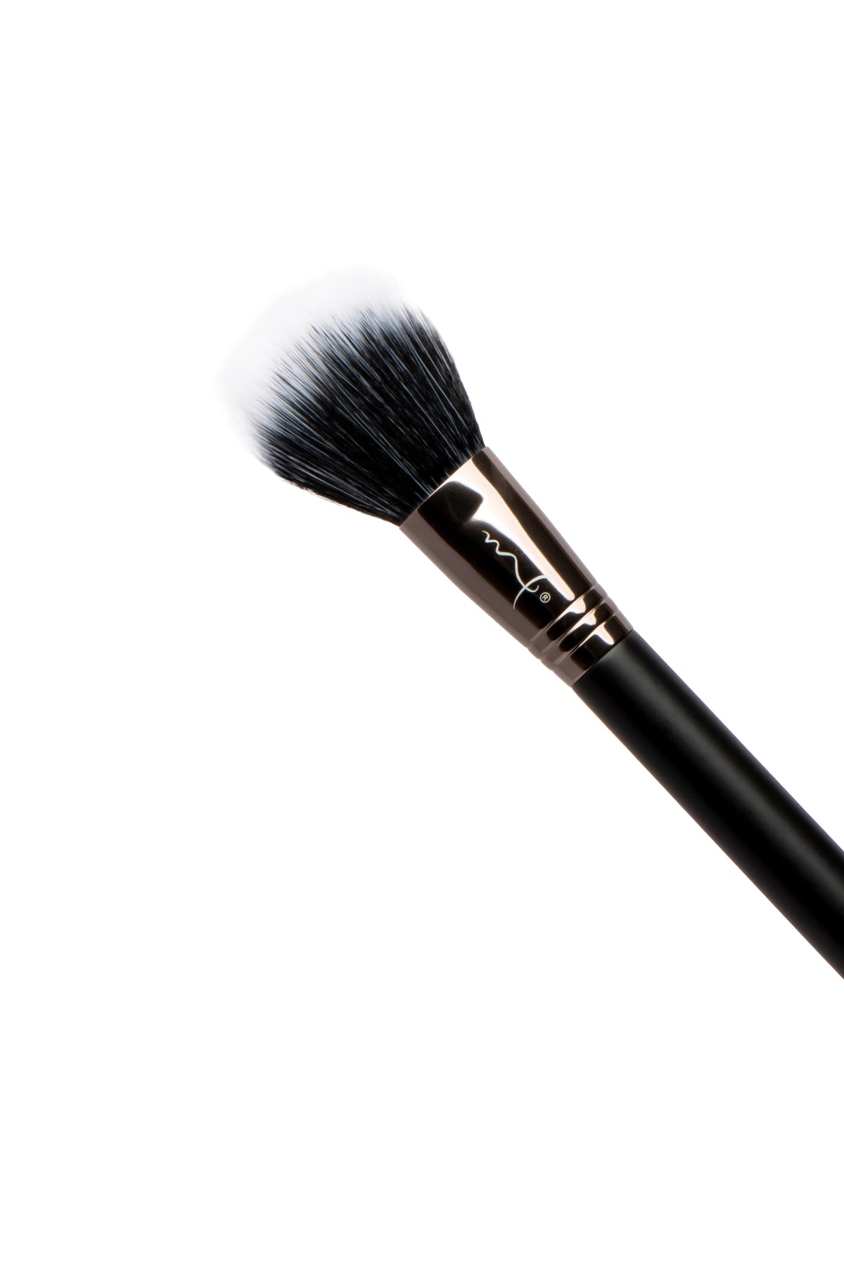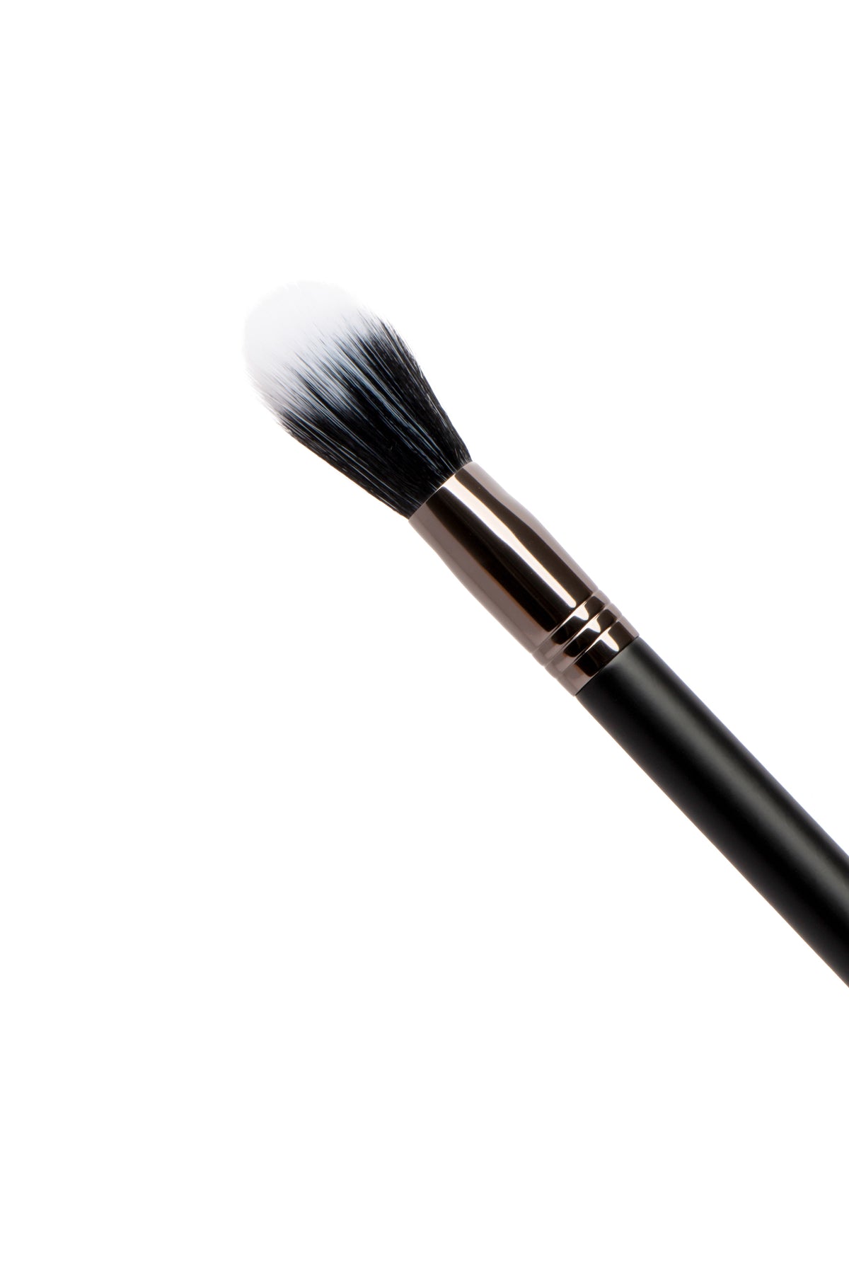 Brocha de doble fibra grande con punta redonda. Aplica productos en polvo, líquidos y en crema con acabado pulido en la piel.