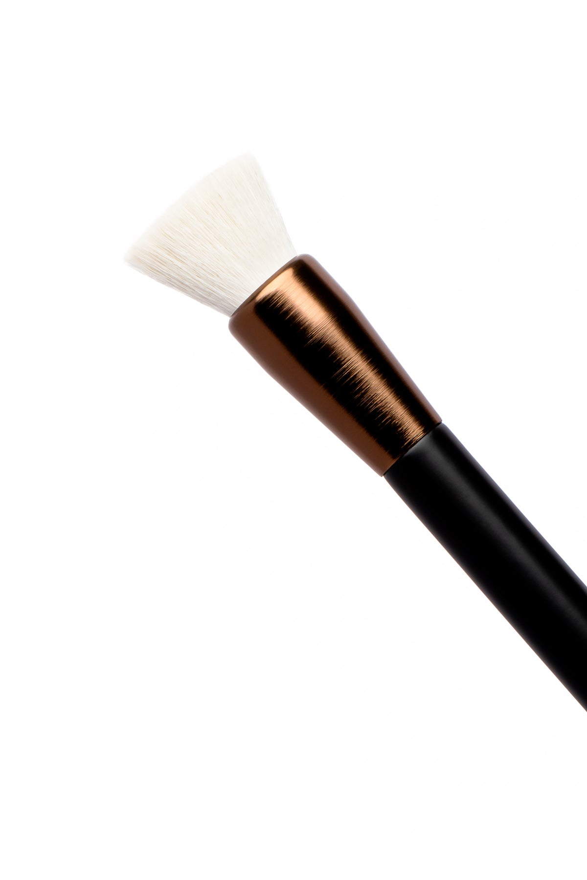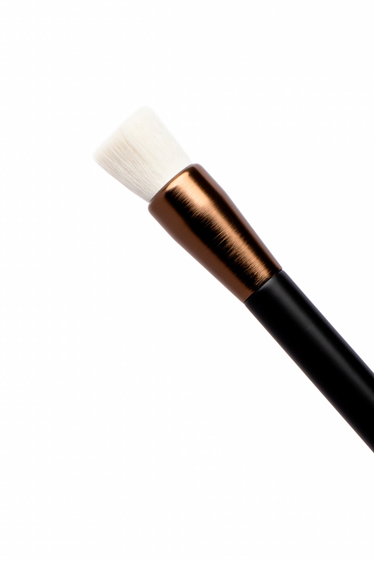 Brocha sintética de NYLON densa de corte plano. Aplica productos líquidos y en polvo con acabado uniforme y pulido. Aporta una cobertura media.