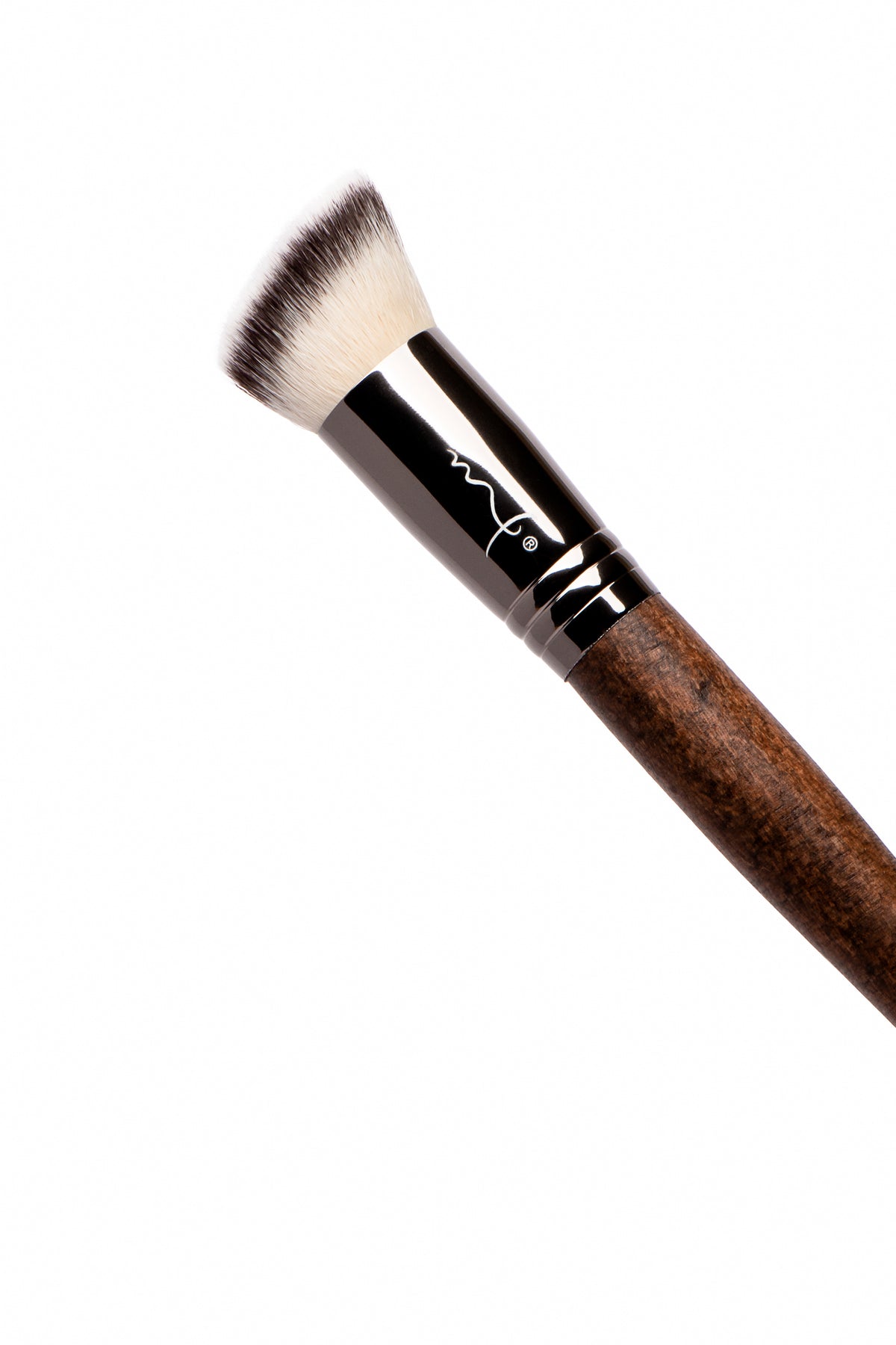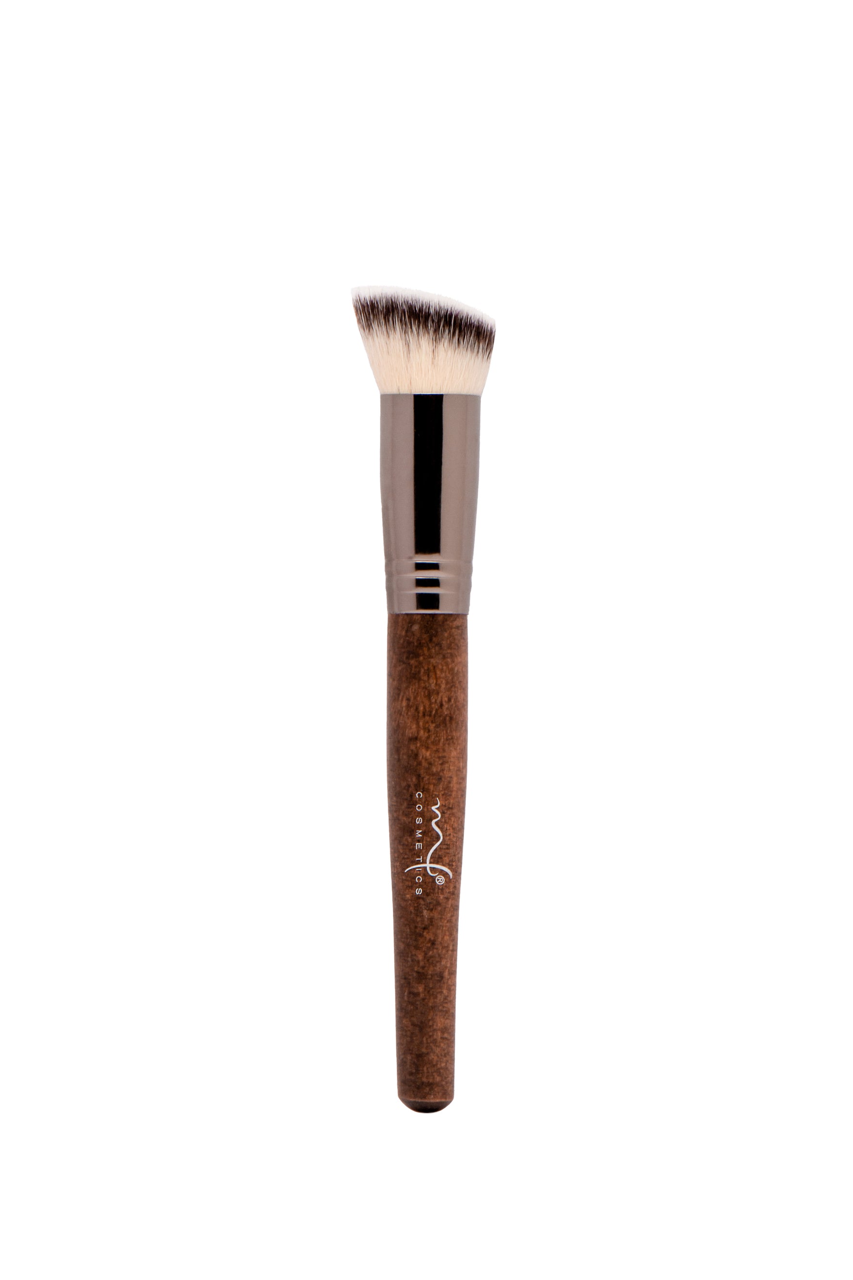 Brocha suave de corte recto inclinado. Aplica, pule y difumina productos en polvo y en crema sobre la piel con cobertura media.