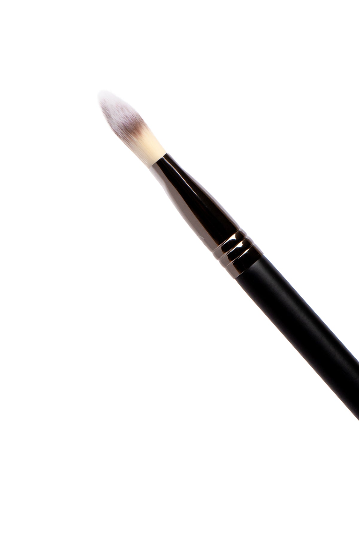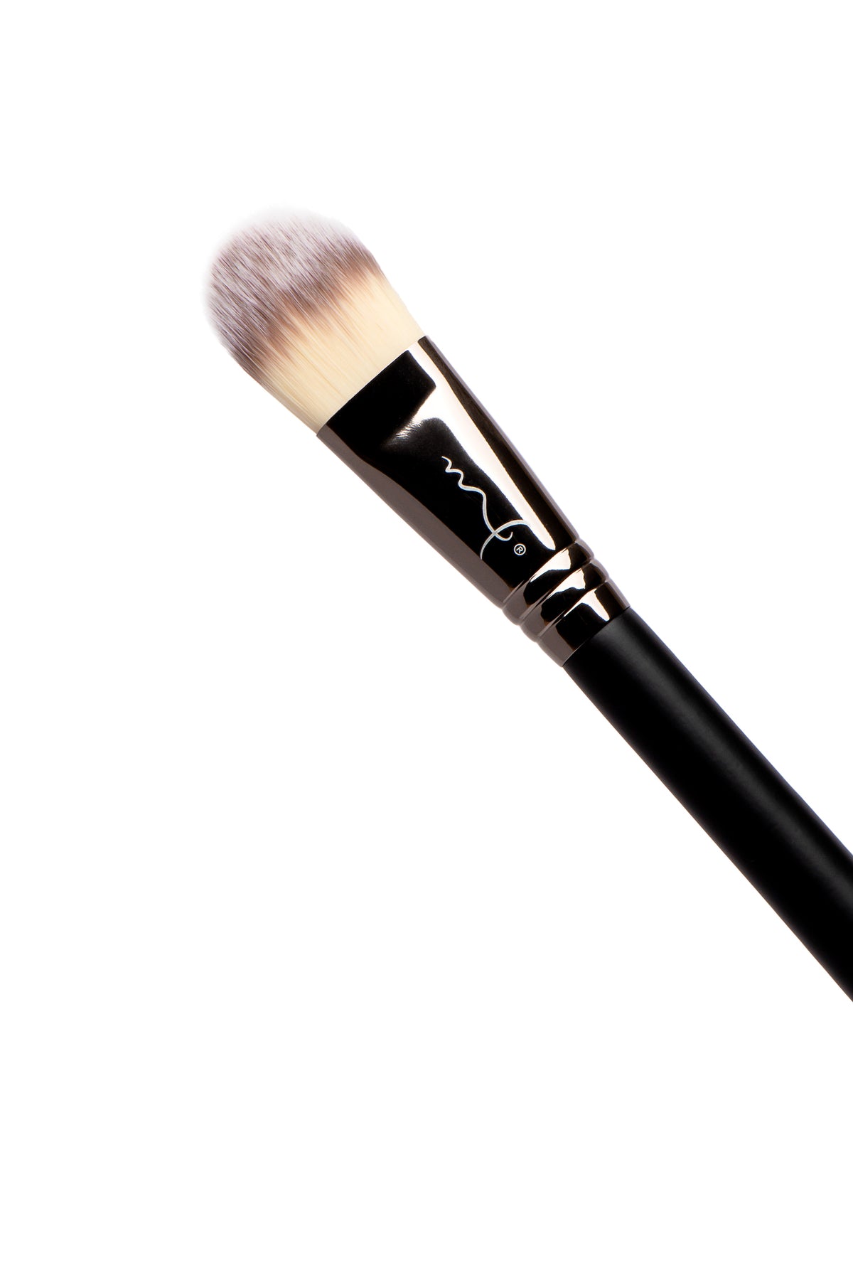 Brocha de forma plana y punta redonda. Aplica productos líquidos y en crema de manera suave y concentrada.