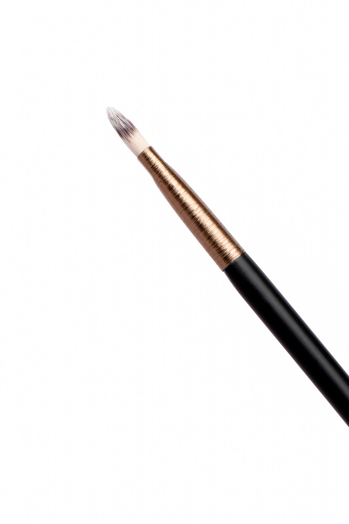 Brocha firme de fibra de NYLON de forma plana y con punta. Aplica productos líquidos y en crema de manera concentrada.