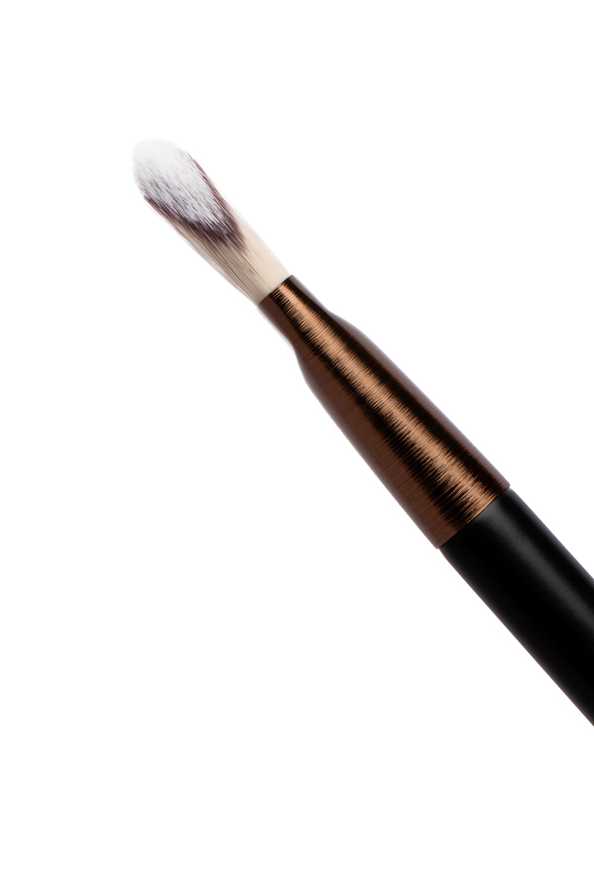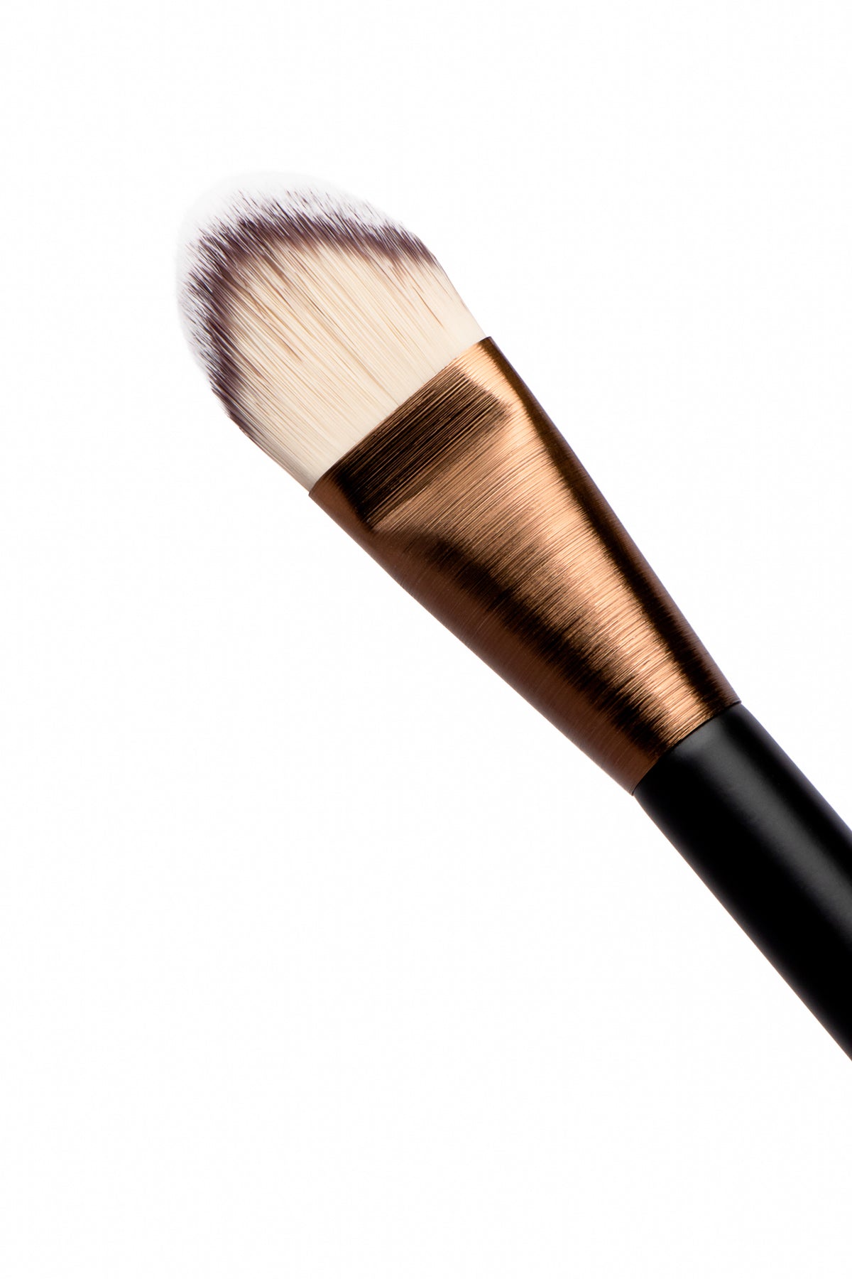 Brocha de NYLON, plana de fibras rígidas con punta. Aplica productos líquidos y en crema de manera concentrada.