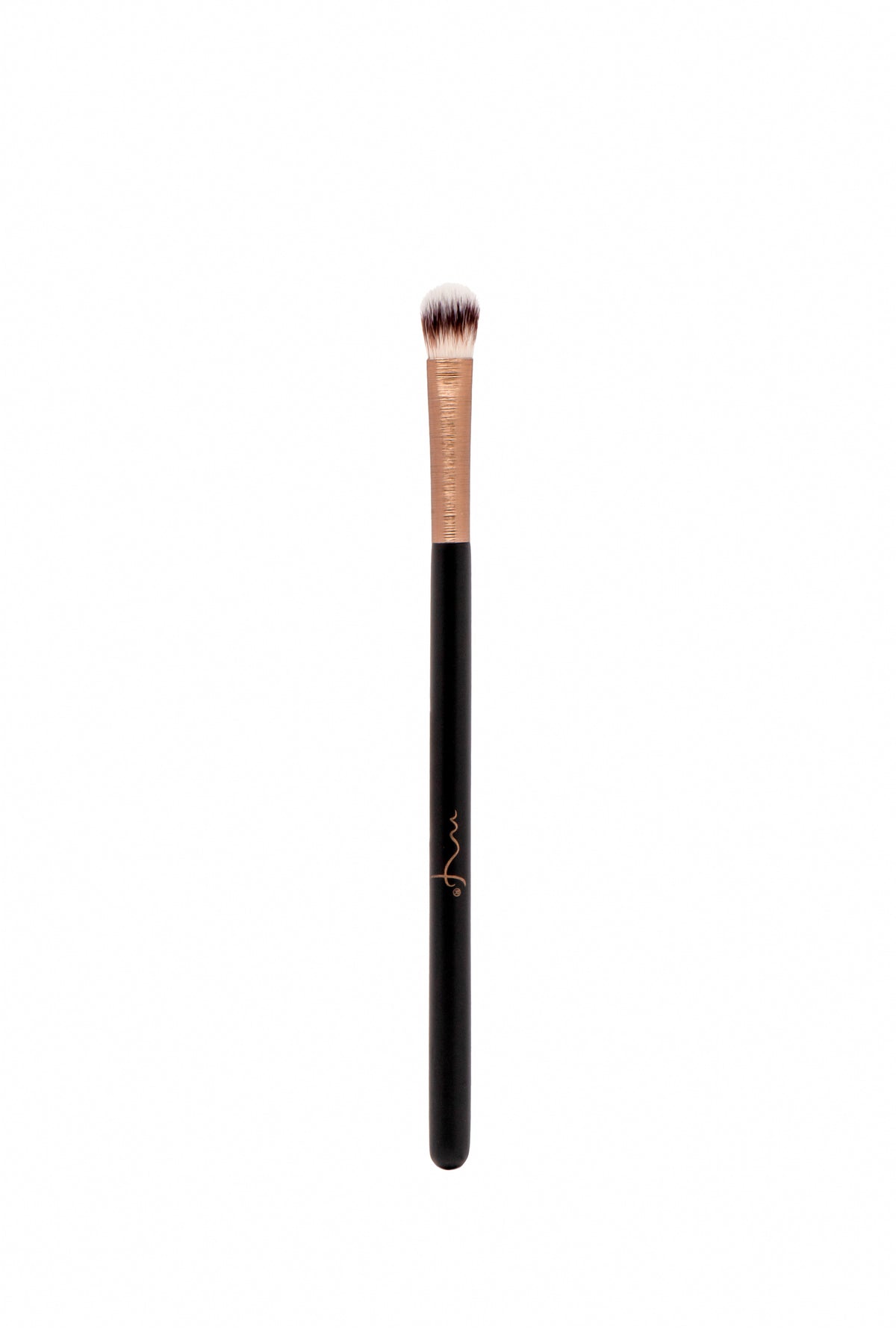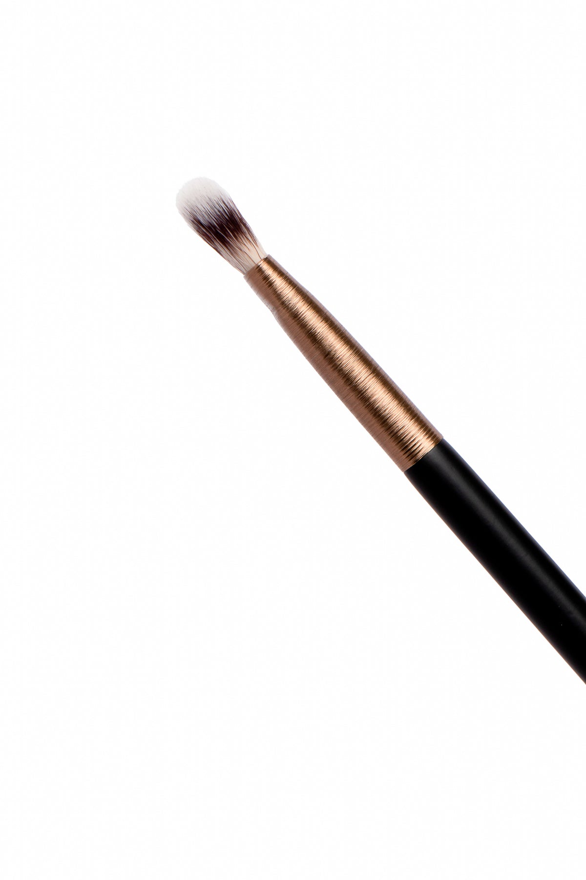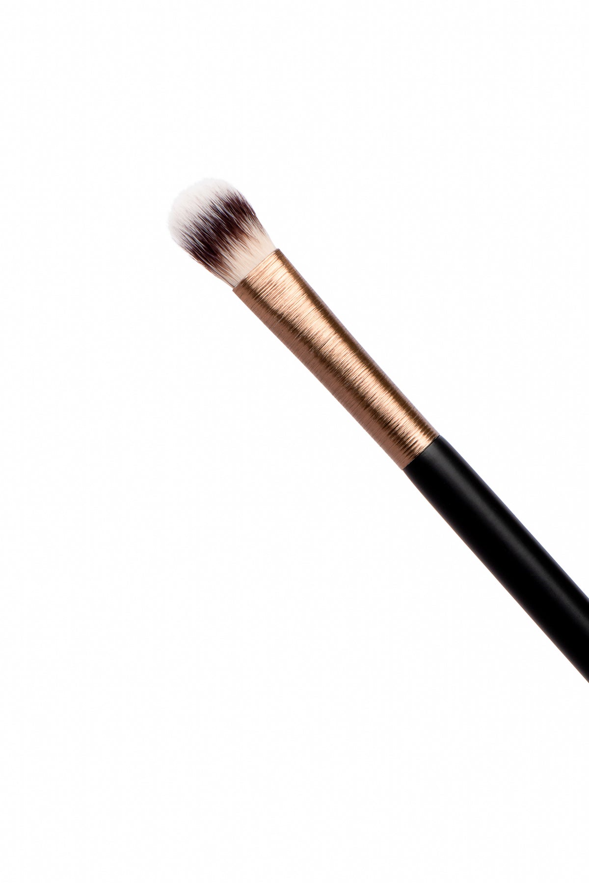Brocha de fibras sintéticas ligeramente firme con punta redonda. Aplica y difumina productos en polvo en el ojo.
