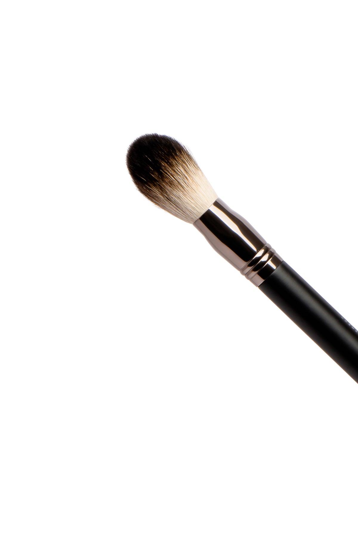 Brocha grande de fibras densa. Aplica y difumina productos en polvo en cara y cuerpo.