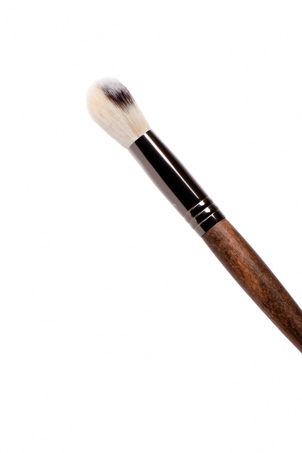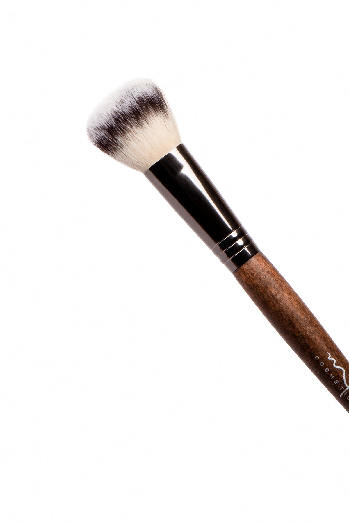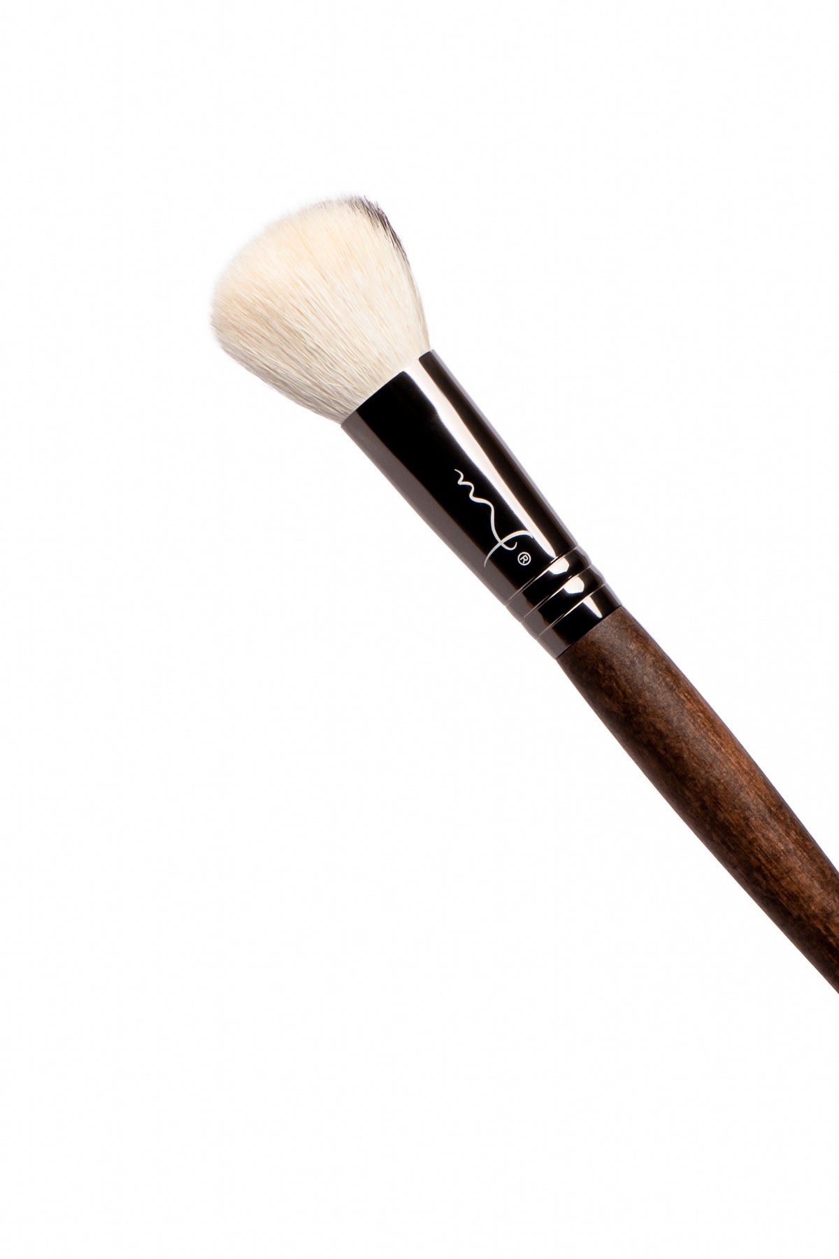 Brocha densa con 50% fibras naturales y 50% fibra sintética suaves de forma plana con punta redonda. Aplica productos en polvo y crema en todo el rostro gracias a su tamaño versátil.