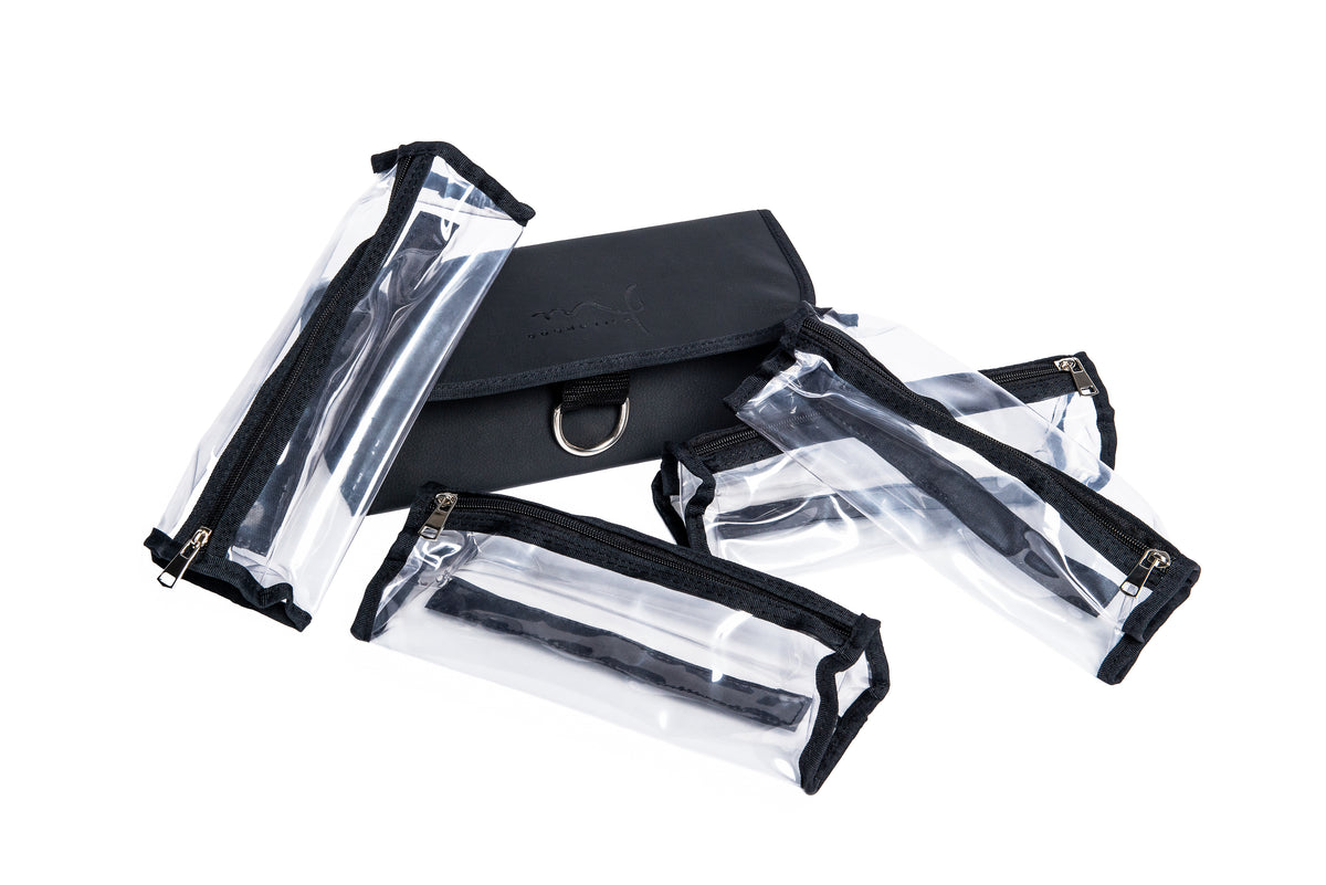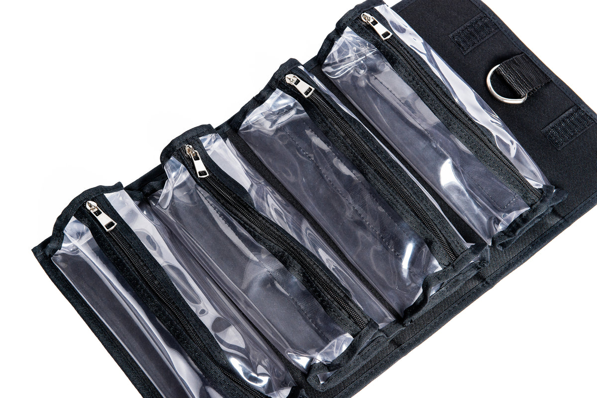 Cosmetiquera de 4 bolsas con cierre. Organiza y separa el cosmético de manera práctica. Su material transparente facilita encontrar lo que necesitas al instante.