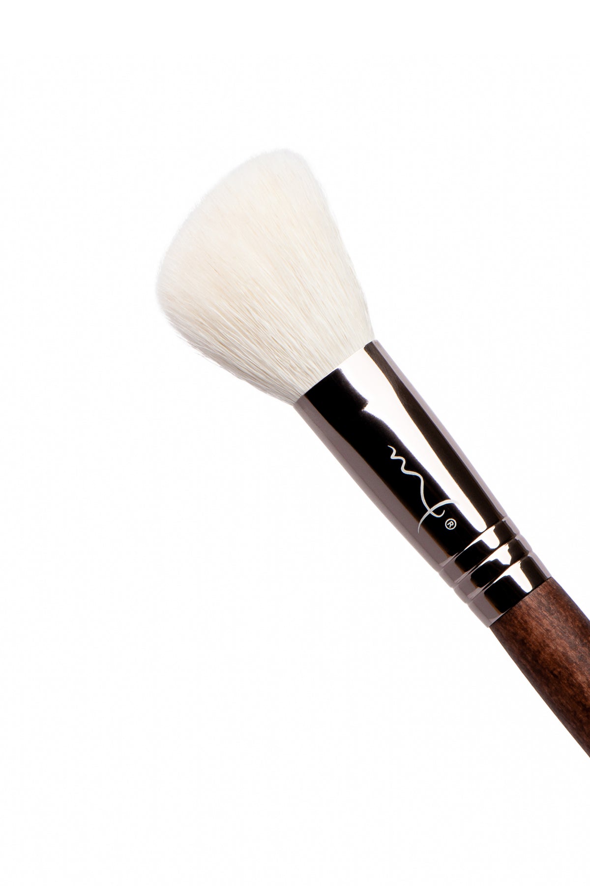 Brocha de fibras suave con corte angular. Aplica y difumina productos en polvo en el rostro.